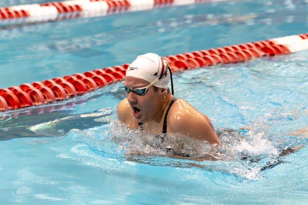 An Indiana women's swimmer competes against the University of Louisville in the 200-meter butterfly Jan. 30, 2026, at the Counsilman-Billingsley Aquatic Center in Bloomington. Indiana took the top four of seven places in the women's 200-meter butterfly.