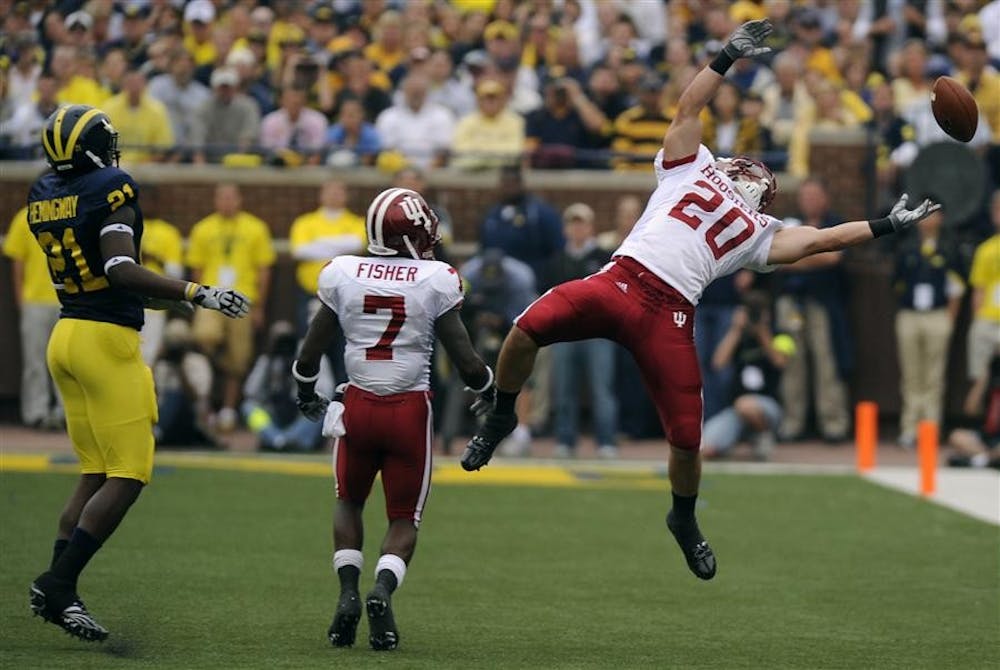 IU safety Austin Thomas, No. 20, watches as a possible interception goes through his hands during a football game against Michigan on Saturday, Sept. 26, 2009 in Ann Arbor, Mich. IU lost 36-33.