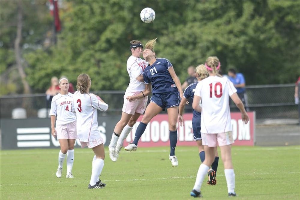 Senior midfielder Devon Beach crashes into Carly Niness of Penn after heading the ball during the Hoosiers' 3-0 loss to Penn Sunday at the Bill Armstrong Stadium. Steph Langan