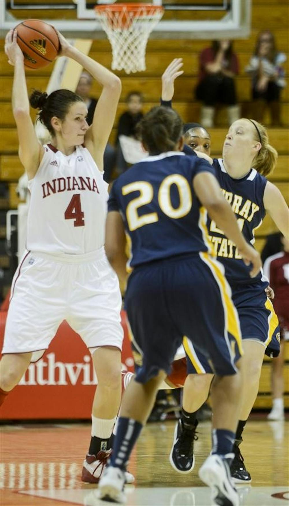 Junior forward Linda Rubene keeps the ball away from opponents during the Hoosiers' 70-67 victory against Murray State Monday at Assembly Hall. Steph Langan
