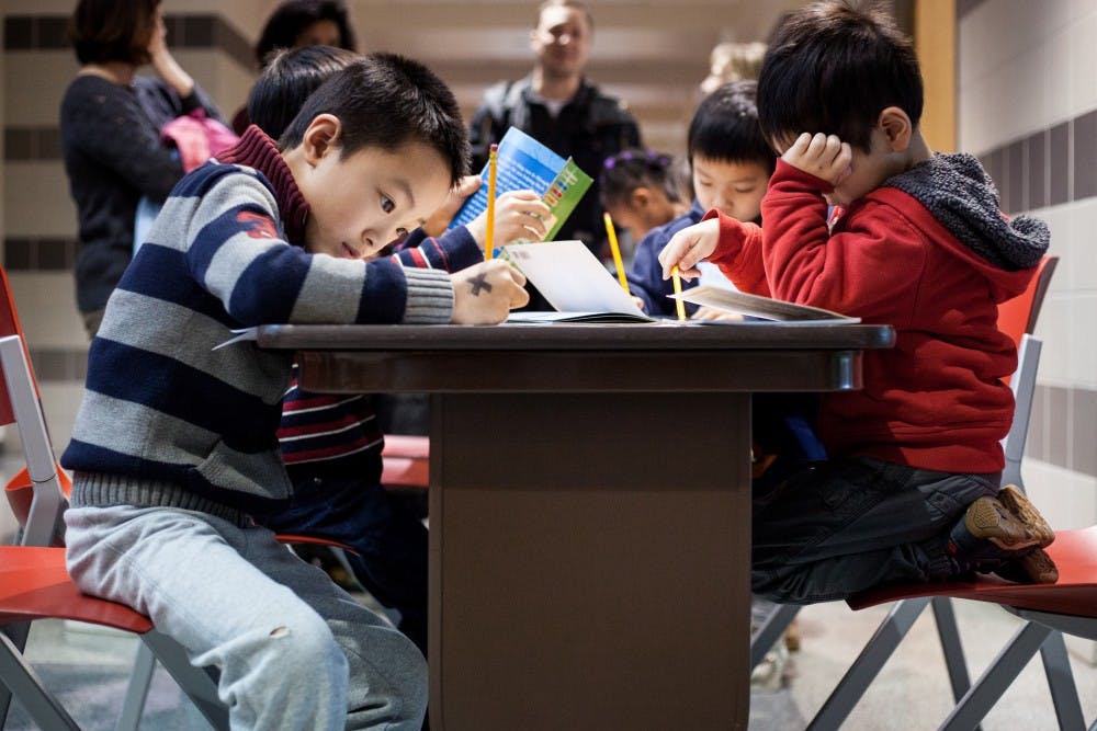 An elementary-age boy fills in a crossword puzzle about Martin Luther King Jr. during the MLK Birthday Celebration on Jan. 15, 2017. The community teach-in for children and their families took place in the IU School of Education. The celebration included coloring activities, a musical performance, an interactive discussion and a celebratory birthday cake.