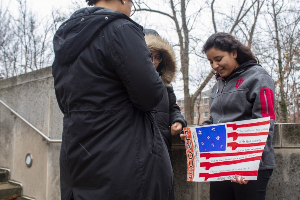 Deisdy Rodriguez holds a sign during the Peace Without a Piece march Thursday, Dec. 6, at the Neal-Marshall Black Culture Center. The marchers met at Sample Gates at 12:30 p.m. and walked through campus.