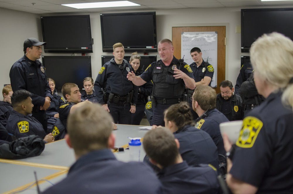 Lt. Andy Stephenson briefs a room of full and part time officers before the Ohio State football game on October 3. Most of their job during games is crowd managment, and Stephenson goes over procedures to deal with an unruly crowd. For this specific game, he also warns of a possible field rush and tells the officers to protect the field goal post from being toppled. Stephenson also addresss the possiblity of more malicious situations such as mass shootings. At the end of the day the safety of the crowd is paramount.