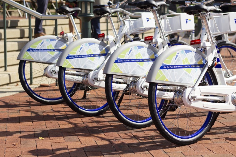 Pace bicycles with fenders advertising the Pace app stand Wednesday, June 20, outside City Hall. Pace, a dockless bike share service operated by the company Zagster, showcased the new smart bikes which will be available to residents, students and visitors starting this month.