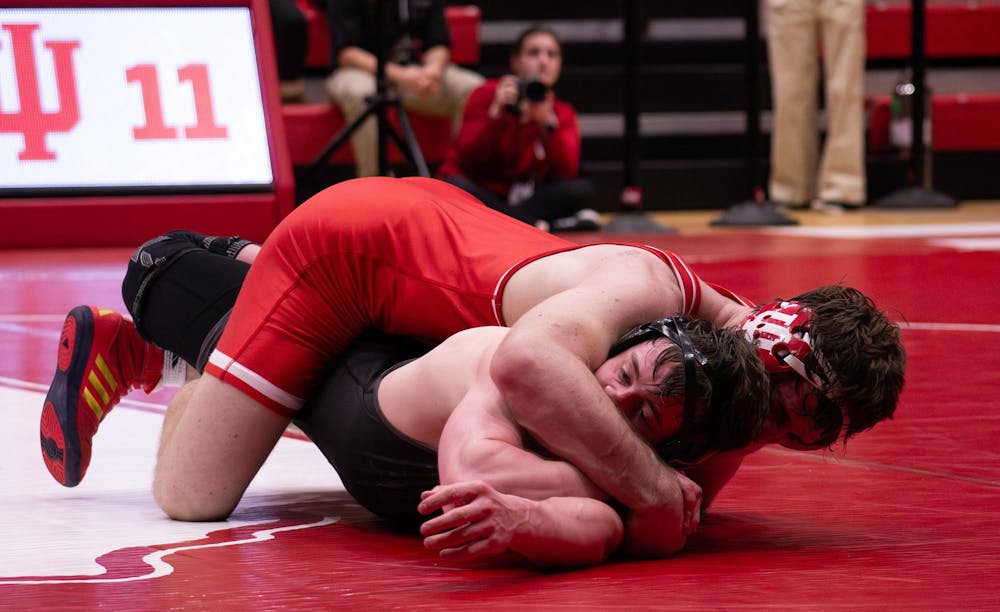 Redshirt freshman Sam Goin attempts to pin his opponent in the match against Purdue on Feb. 20, 2026, at Wilkinson Hall in Bloomington. His victory gave the Hoosiers a 14-13 lead, their first of the second half. Kaitlyn Stacy