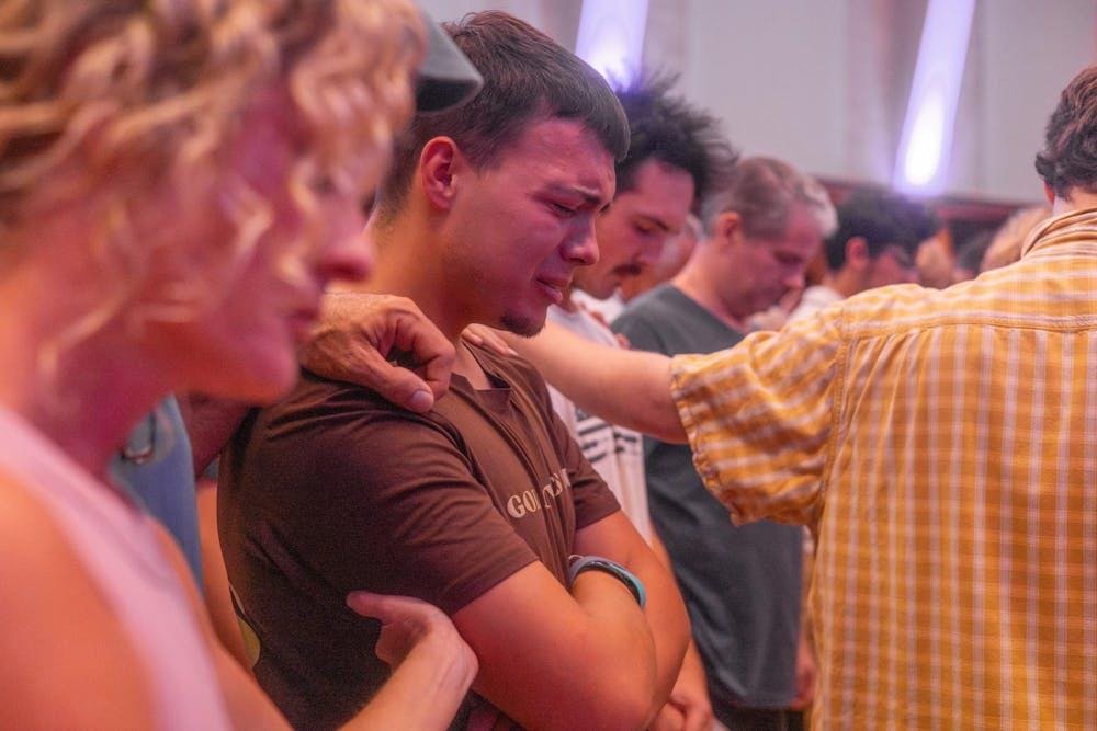 An attendee of the vigil held in Charlie Kirk's honor gets emotional during a prayer led by Chi Alpha pastor Derek Britt on Sept. 14, 2025, at Indiana Memorial Union's Alumni Hall in Bloomington. Britt asked attendees to place their hands on students in the crowd as they prayed for them.