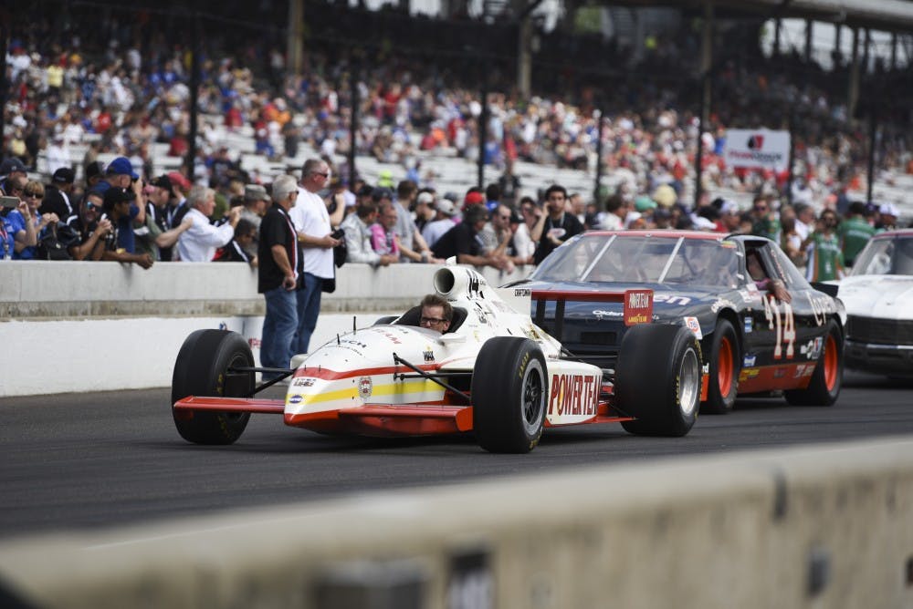 The historic race cars make a lap around the track. One of the cars was so old that it had to be pushed by drivers. Rose Bythrow and Rose Bythrow and Rose Bythrow