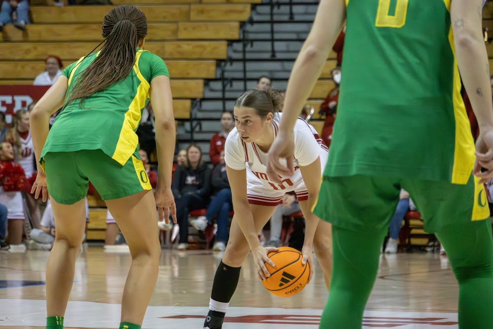 Senior guard Shay Ciezki dribbles the ball in the game against Oregon on Feb. 22, 2026, at Simon Skjodt Assembly Hall in Bloomington. Ciezki played 39 minutes in the game. Chloe LaVelle