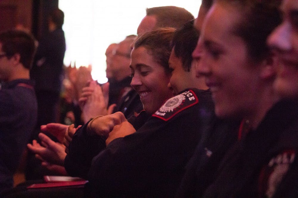 IU police officers fist bump after being sworn in as police officers Aug. 11 at the 45th Indiana University Police Academy graduation ceremony in Alumni Hall in the Indiana Memorial Union.