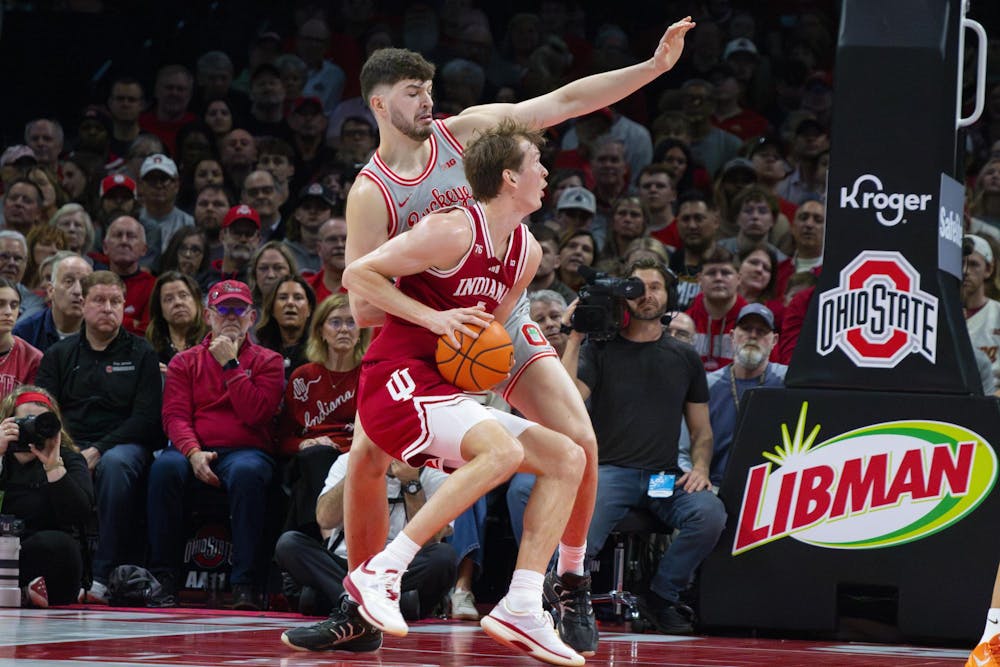 Senior forward Reed Bailey looks up before attempting a shot during the game against Ohio State on March 7, 2026, at the Jerome Schottenstein Center in Columbus, Ohio. Bailey started the game on the bench and played 29 minutes.