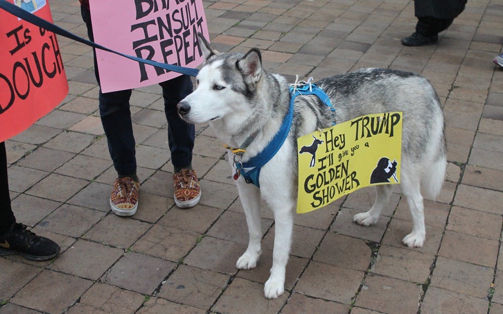 A husky wears a sign during the Women's March on Washington. Matt Rasnic and Matt Rasnic