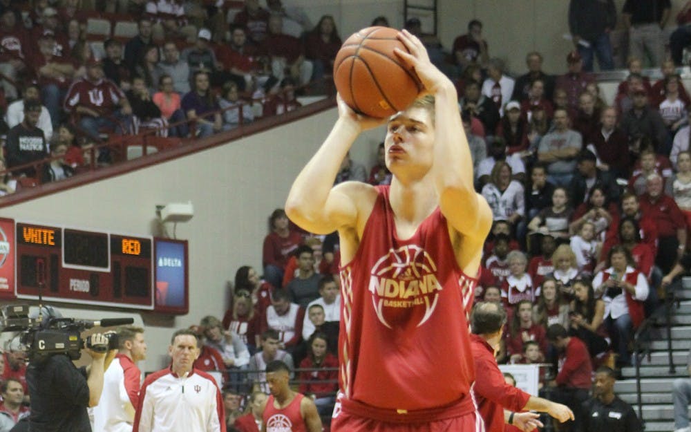 Freshman Grant Gelon shoots in the three point contest during Hoosier Hysteria Saturday Evening at Assembly Hall. Matt Rasnic and Matt Rasnic