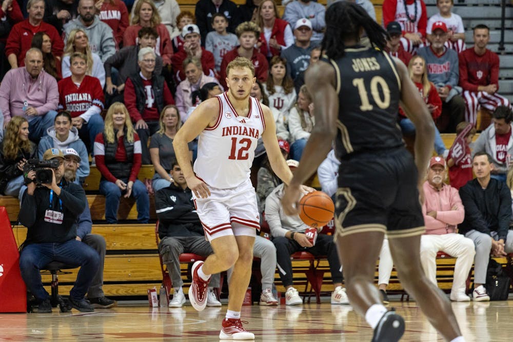 Redshirt senior Tucker DeVries dribbles the ball down the court in a game against Lindenwood University on Nov. 20, 2025, at Simon Skjodt Assembly Hall in Bloomington. The Hoosiers fell to the University of Louisville 87-78 on Saturday.
