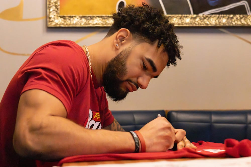 Elijah Sarratt signs a jersey Jan. 22, 2026, at Raising Cane's in Bloomington. Sarratt was the last of the three Indiana football players to arrive at the event.