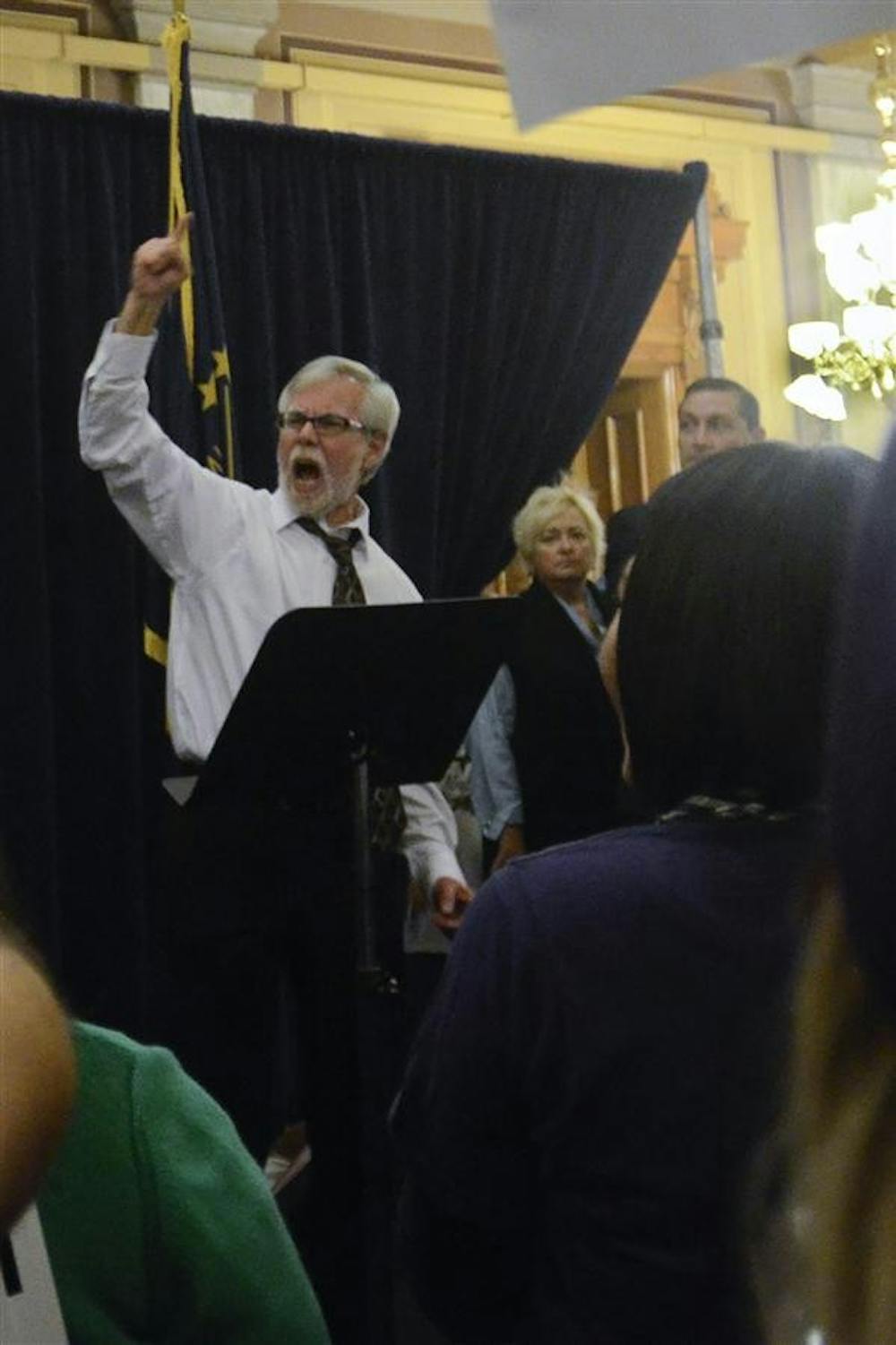 Sen. Tim Lanane, D-District 25, pumps his fist into the air as he speaks to a crowd of protestors after the State of the State address Tuesday at the Indiana Statehouse. A number of Democrats made short speeches.