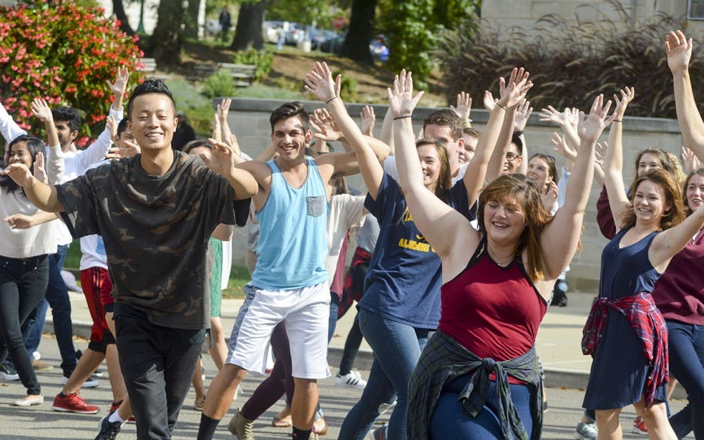 IU Students dance to Andy Grammer’s “Keep Your Head Up” during the flash mob Tuesday afternoon in the Fine Arts Plaza. The short dance caught the attention of many students and Bloomington residents as many arrived to the plaza early to see the performance.