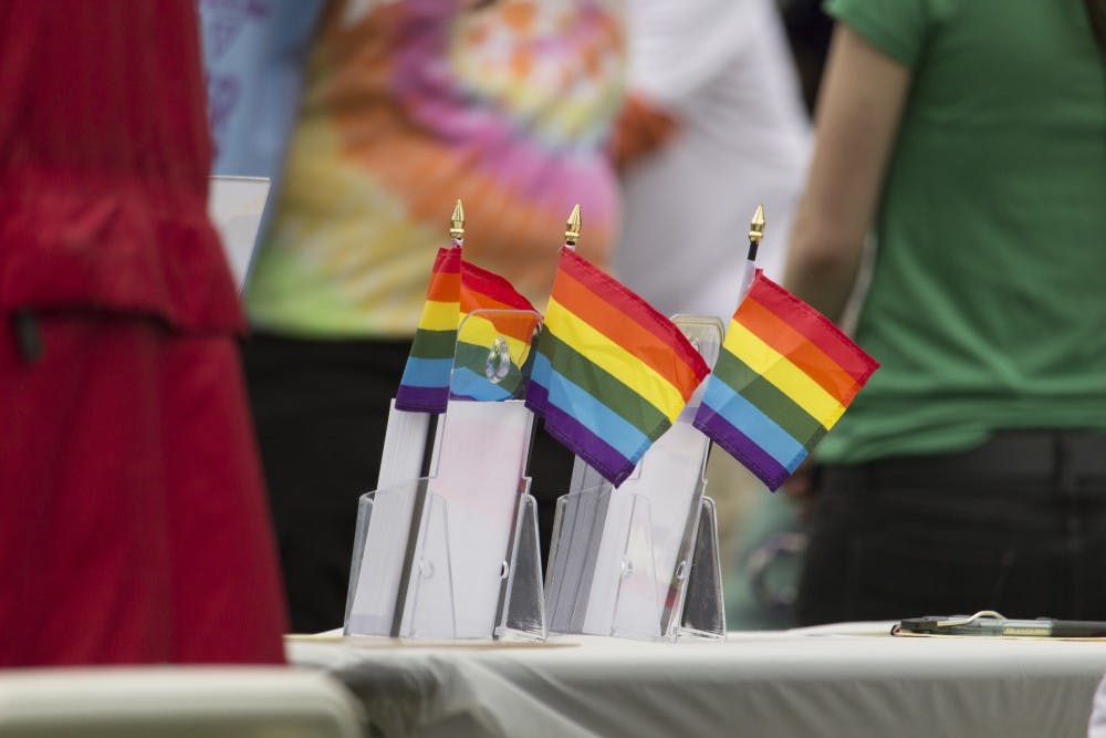 Gay pride flags stand on a vendor’s table at the South Central Indiana AIDS Walk on Friday, April 13, at the Waldron Hill Buskirk Park. The event featured different vendors and local Bloomington food trucks. Matt Begala