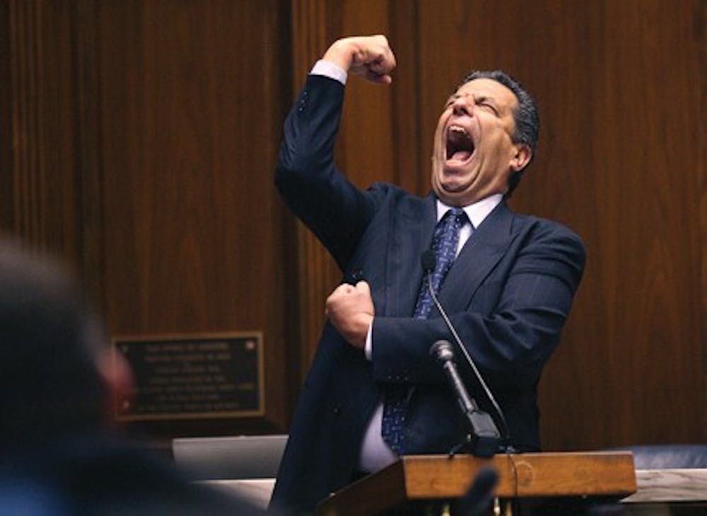 Jon "Bowzer" Bauman, 60, a co-founder of the band Sha Na Na, strikes his famous pose from his playing days with the band in the House chambers at the Indiana Statehouse as he begins his testimony to the House Public Policy Committee on Senate Bill 192 (truth in music advertising) on Wednesday, Feb. 20, 2008. The bill would prohibit performances that deceptively imply there is an affiliation between the performers and a recording group. In 1983, Bauman left the group, which performed '50s rock songs at Woodstock in 1969 and starred in the 1979 movie, "Grease." Several original members still perform with Sha Na Na, which plays about 100 concerts a year. The committee unanimously passed the bill out of committee and onto a vote on the House floor. Bauman, who often testifies on behalf of similar bills in other states, launched into a few lyrics woven into his testimony to the admiring legislators. (AP Photo/Charlie Nye / The Indianapolis Star).