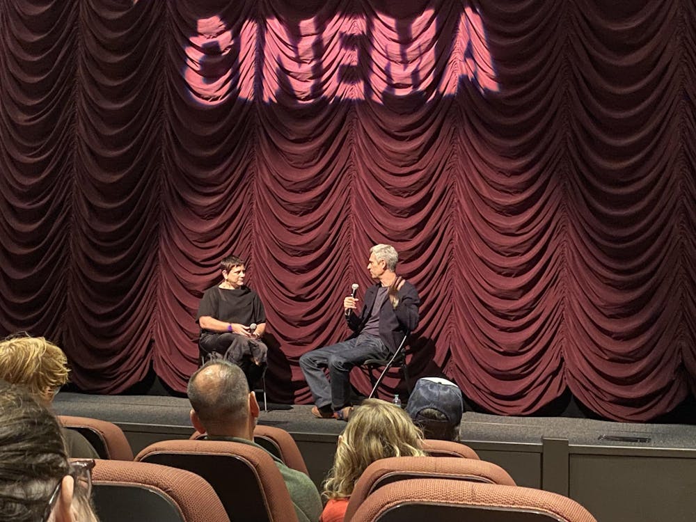 Alicia Kozma (left) and Mike Farah discuss Farah's work as a producer Nov. 7, 2025, at the IU Cinema. The Q&A followed a showing of "Weird: The Al Yankovic Story," a parody of the musical biopic genre. Addison Jacoby