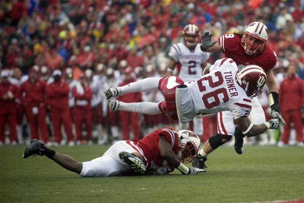 Freshman running back Nick Turner is tackled by Wisconsin's Blake Sorensen (right) during IU's 83-20 loss to the Badgers on Saturday in Madison, Wis. Peter Stevenson