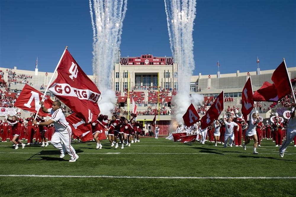 IU cheerleaders take the field before the team, before IU's 36-34 win against Arkansas State on Saturday at Memorial Stadium. Peter Stevenson