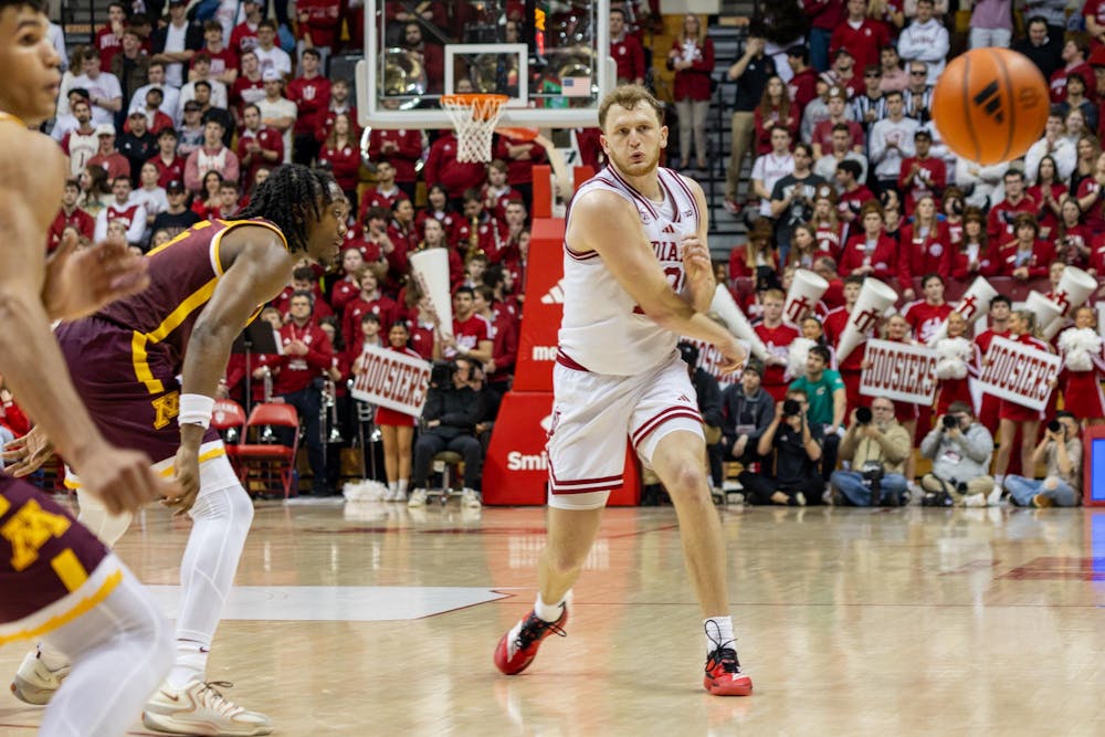 Redshirt senior forward Tucker DeVries passes the ball during the game against Minnesota on March 4, 2026, at Simon Skjodt Assembly Hall in Bloomington. DeVries scored 13 points in the game. Briana Pace