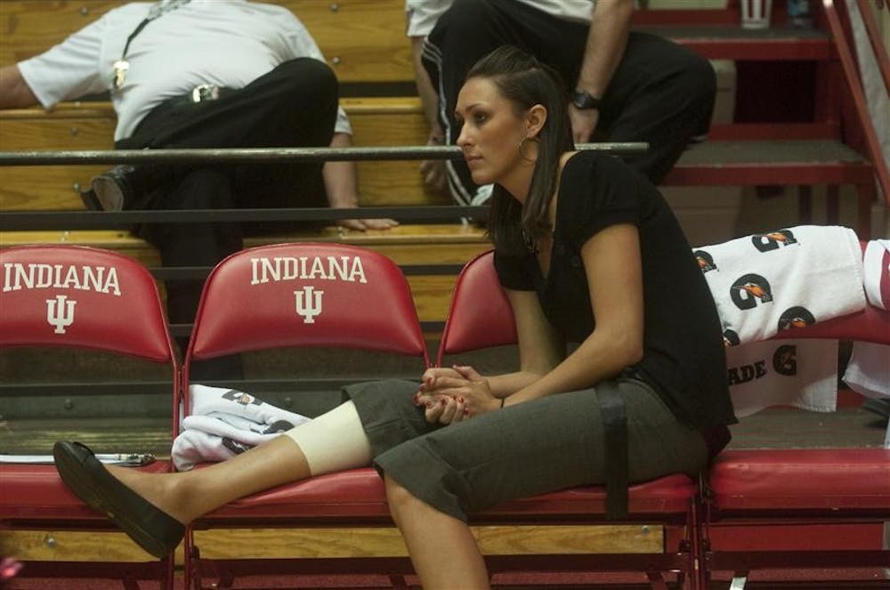 Sophomore forward Lindsay Enterline watches from the sidelines during the Hoosiers’ game against Grand Valley State on Nov. 5. Enterline hurt her ACL during practice earlier this year.