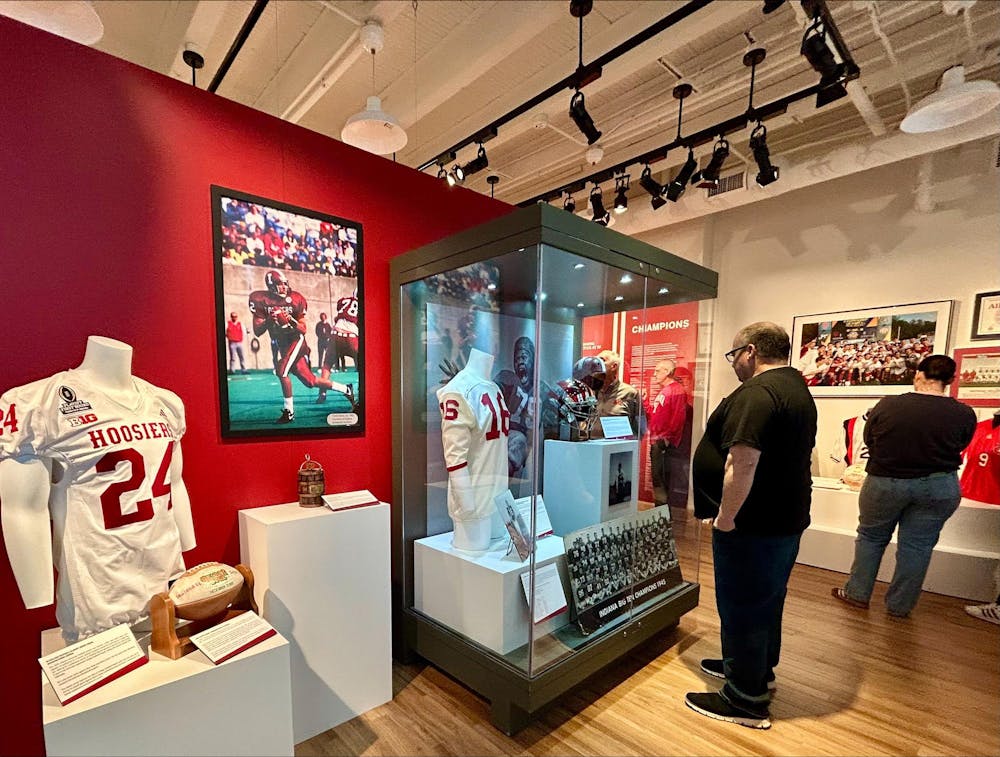 Community members admire memorabilia at the “Outfitting IU Athletics: Hoosier Champions” exhibit Nov. 14 at the McCalla School in Bloomington. Attendees examined the display celebrating the history of IU sports.
