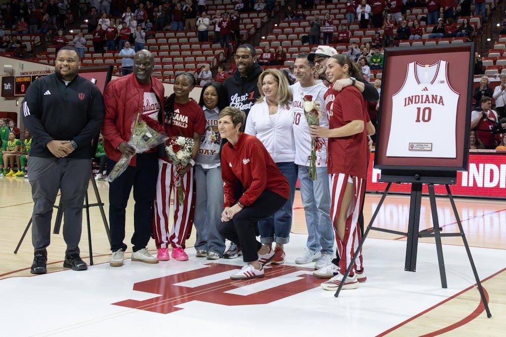 Head coach Teri Moren takes a photo with senior guards Jerni Kiaku and Shay Ciezki before the game against Oregon on Feb. 22, 2026, at Simon Skjodt Assembly Hall in Bloomington. The senior players were honored before the game and the managers and practice players were honored after the game.