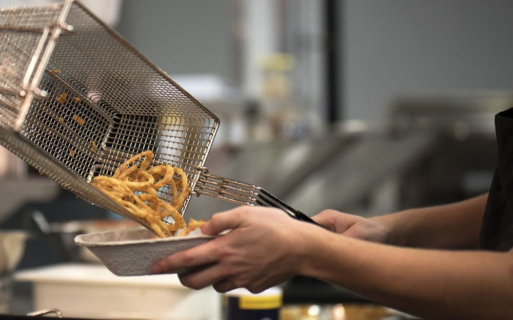 Jason Fruits empties fried onions into the to-go container Tuesday afternoon at the Clustertruck store on E. 10th Street. Clustertruck has hot, fresh food that takes on average 21 minutes to deliver.