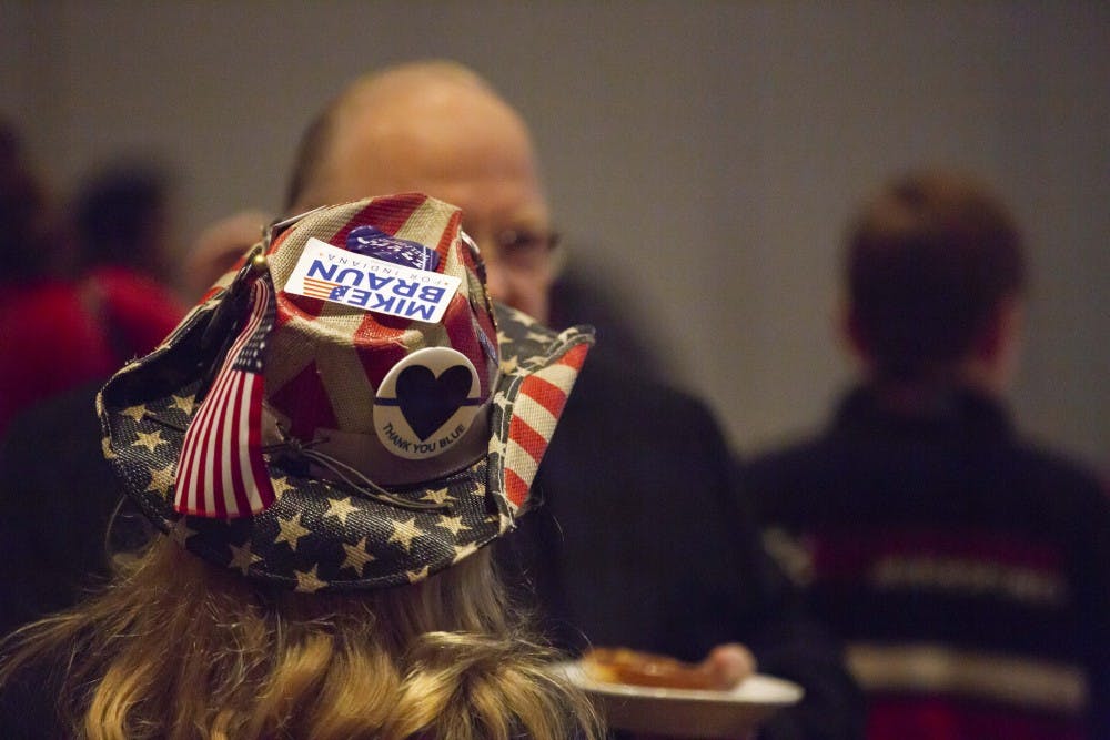 A woman wears a decorated hat with a Mike Braun, R-Indiana, sticker during the watch party for Braun on Nov. 6 in the JW Marriott in Indianapolis. Braun is challenging incumbanet Sen. Joe Donnelly, D-Indiana, for the senate seat.