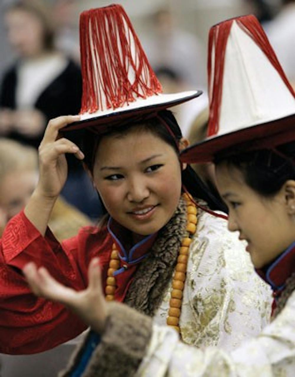 Members of the Tibetan Association of Western Massachusetts Tenzin Chodon, of Northampton, Mass., left, and Tenzin Dhekyong, of Amherst, Mass., talk together at Smith College in Northampton, Mass, Wednesday, while they wait for an event of Tibetan spiritual leader the Dalai Lama starts. Chodon and Dhekyong will perform Tibetan traditional dances wearing Tibetan costume during the event. (AP Photo/Chitose Suzuki) Chitose Suzuki