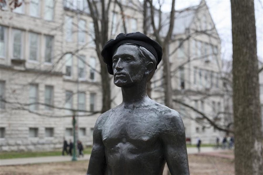 Adam, one of the two figures that make up the Jean Paul Darriau bronze sculpture "The Space Between: Adam and Eve," dons a beret as the temperature drops in Bloomington. The statue of Adam was damaged during a wind storm in May 2011 when a fallen tree dented the figure's head and broke its ankle. After several repairs, the life-sized figure reunited with the Eve figure in Dunn's Woods this past August.
