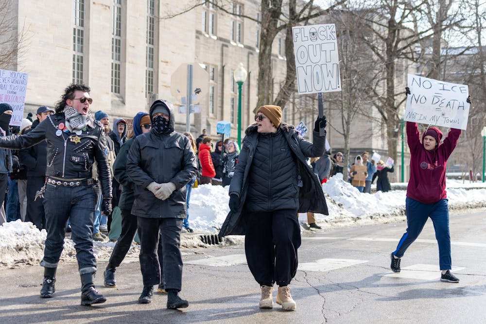 Protesters march into the street Jan. 30, 2026, at the corner of Indiana Avenue and Kirkwood Avenue in Bloomington. Protesters walked together from City Hall to Sample Gates. Briana Pace