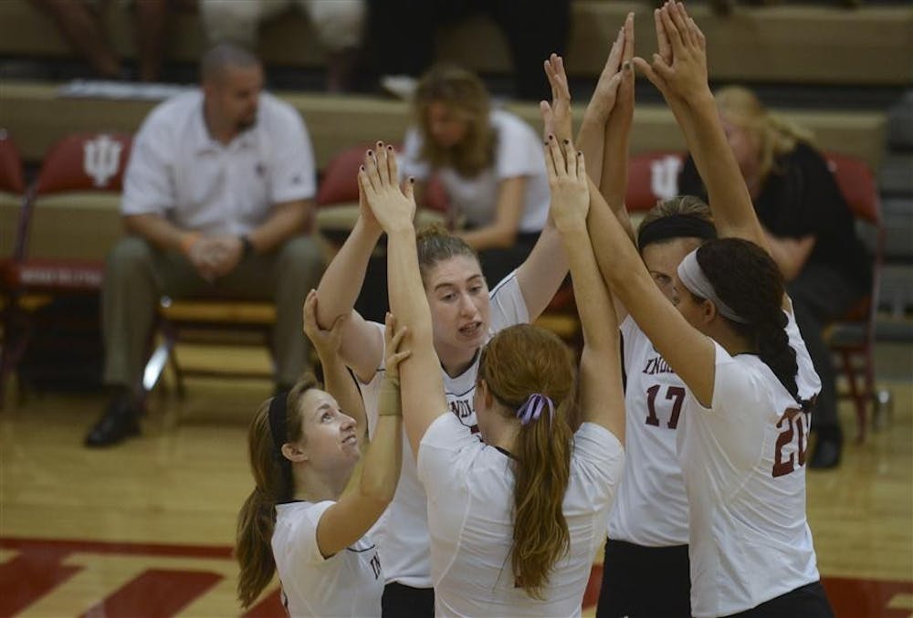 Members of the volleyball team put their hands together on the court Saturday during their match against Bowling Green at University Gym. IU lost 3-1. Steph Langan