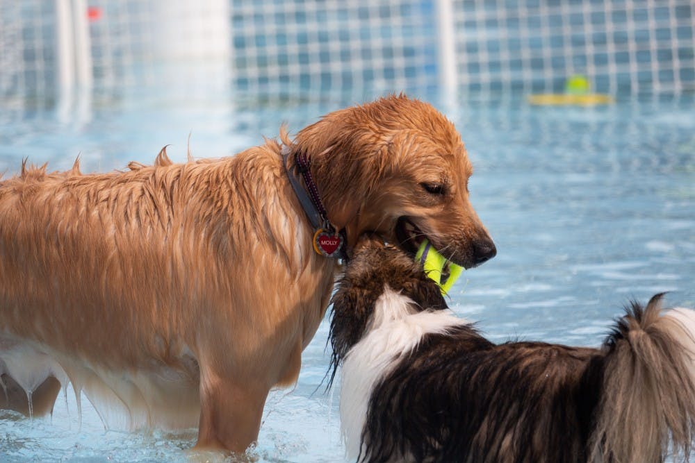 Molly, a 2-year-old golden retriever, and Jasmine, a three-year-old collie, share a rubber chew toy Aug. 9 during the Drool in the Pool event at Mills Swimming Pool.