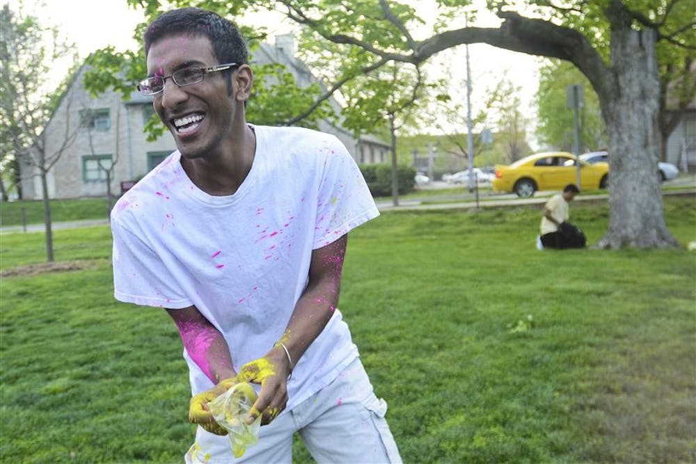 A paricipant in Holi smiles as he prepares to throw a handfull of colored powder on Wednesday in Dunn Meadow. Steph Langan