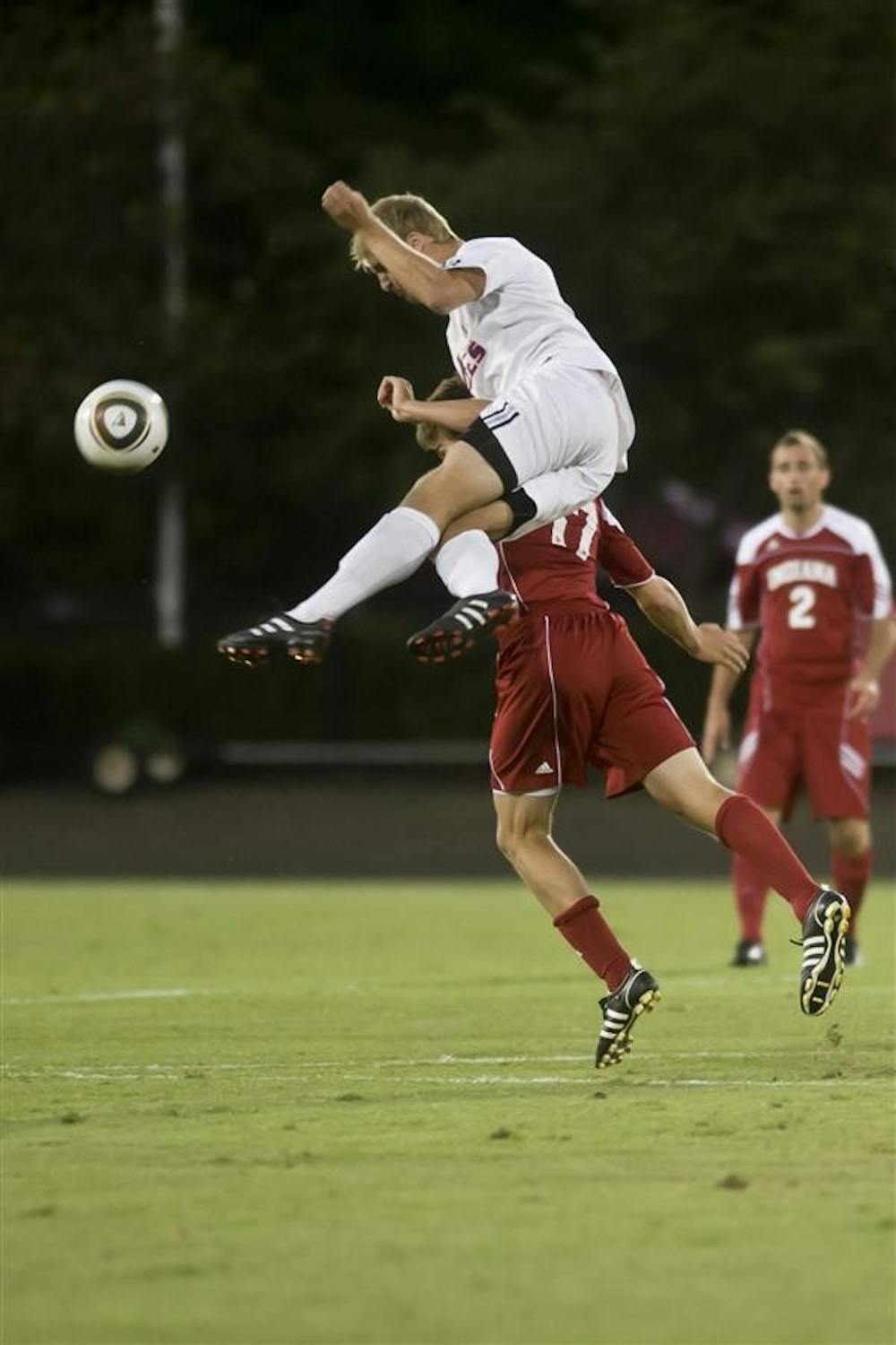 Evansville forward Taylor Parker challenges IU's Jacob Bushue for a header during IU's 1-0 win against the Purple Aces Wednesday at Bill Armstrong Stadium. Peter Stevenson