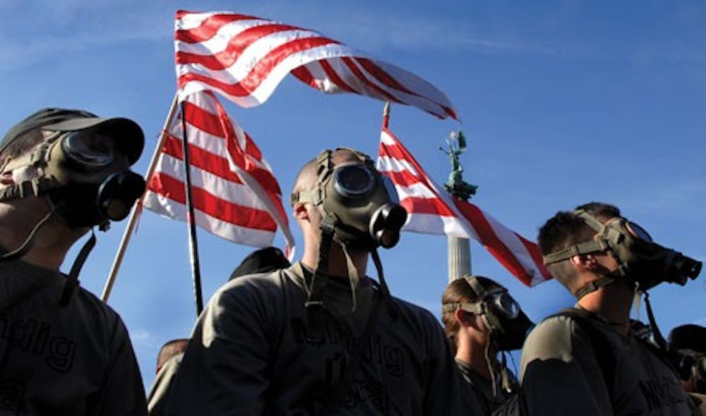 Right-wing demonstrators; wearing gas masks, gathered waving Hungarian and historical flags to call for the country's Prime Minister Ferenc Gyurcsany to resign and to protest against the fiscal reforms of his Socialist government at the Heroes' Square of Budapest, Hungary on Saturday. The Hungarian right-wing opposition has been organizing anti-government demonstrations since September 2006. (AP Photo/Bela Szandelszky)