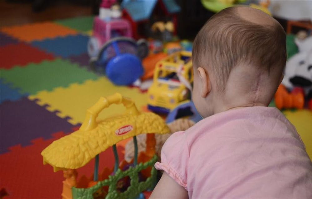 Willa Rose Frankenberger sits on a mat and plays with her toys on a Sunday afternoon in April in her home in Louisville. She has lost hair on her head due to the proton therapy treatments and the removal of a brain tumor which left a scar. There is a slight possibility that Willa's hair will never grow back in the places that the proton beam entered, however her parents Jim and Jody are hoping that the treatments did not affect hair growth permanently.