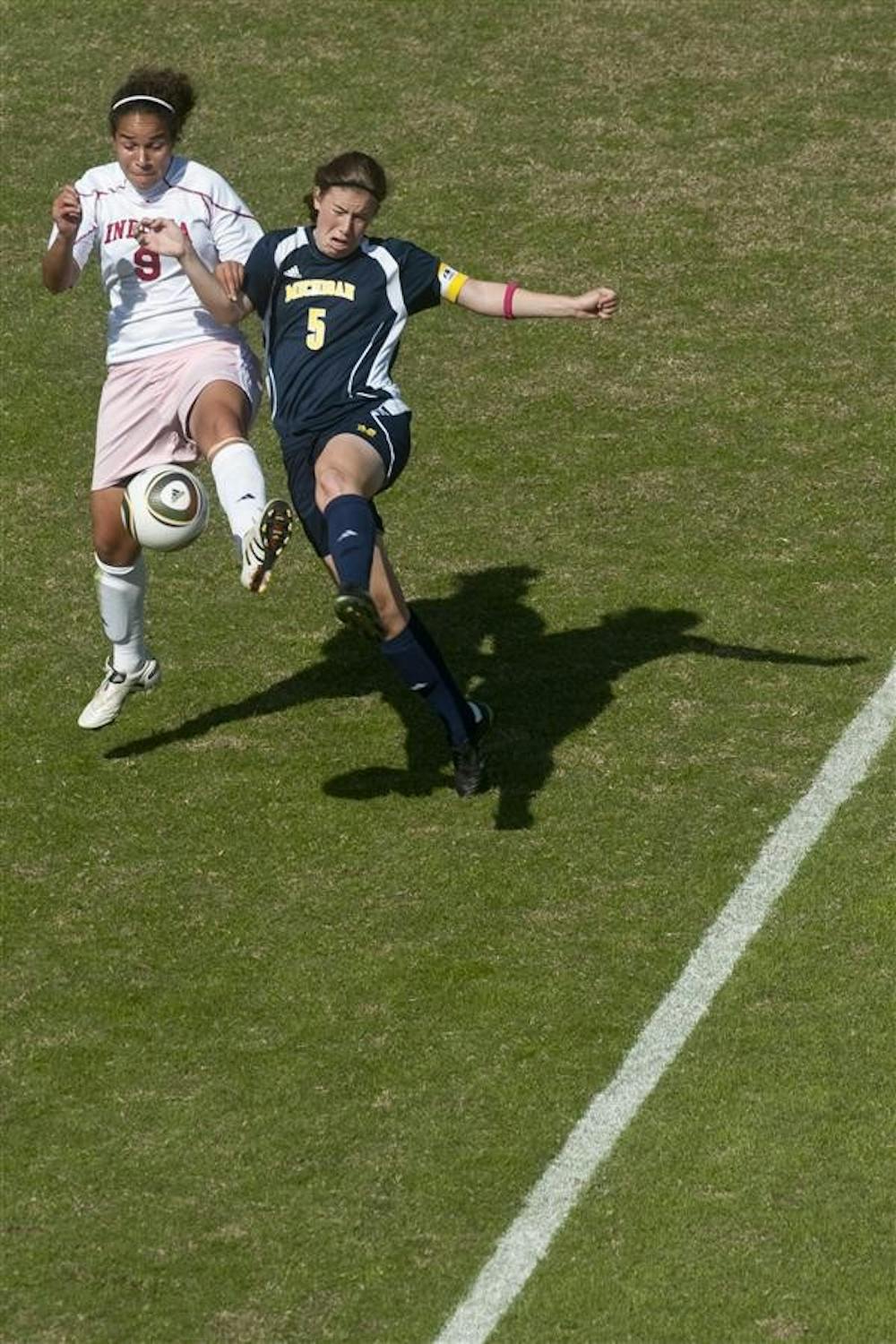 Sophomore forward Ori Velasquez challenges Michigan's Jackie Carron for the ball during IU's 2-1 loss to the Wolverines on Sunday at Bill Armstrong Stadium. Peter Stevenson