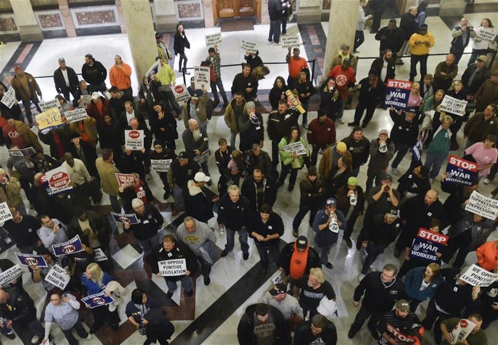 Protestors gather after the State of the State address Tuesday at the Indiana Statehouse. Many protestors are unhappy with right-to-work legislation currently being considered in the House.