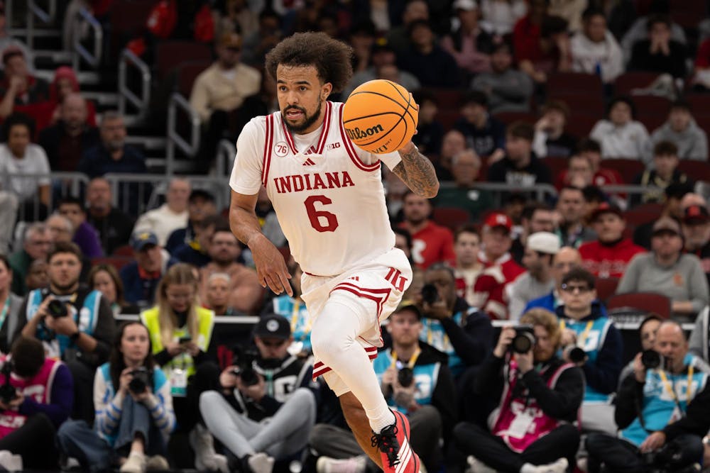 Sixth-year senior guard Tayton Conerway dribbles the ball down the court as Indiana takes on Northwestern during the Big Ten Tournament on March 11, 2026, at the United Center in Chicago. Conerway had 14 points in the game.