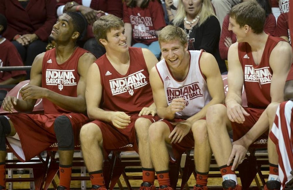 Maurice Creek, Jordan Hulls, Jonny Marlin and Cody Zeller laugh from the team bench during Hoosier Hysteria on Saturday at Assembly Hall.