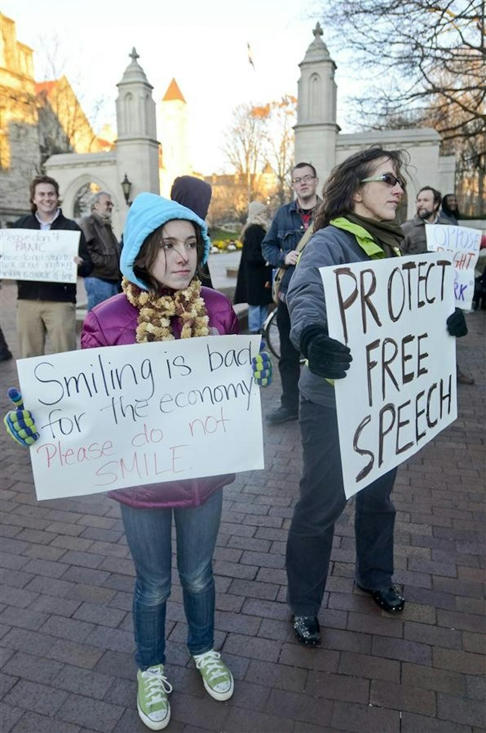 Lydia and Carlene Quinn hold up signs about the economy and free speech during a rally Thursday at the Sample Gates. People yelled chants and showed their signs to gain the attention of passers by. Steph Langan