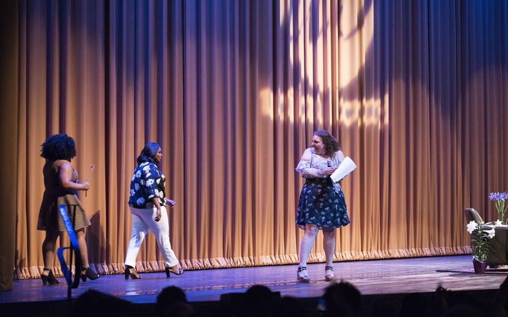 Yasmine Raouf, director of lectures, welcomes Alexis Burr (left) and Octavia Spencer (center) onto the stage. The Union Board sponsored event was free to all students, and attendees gathered in line hours before the event to get seats close to the front.