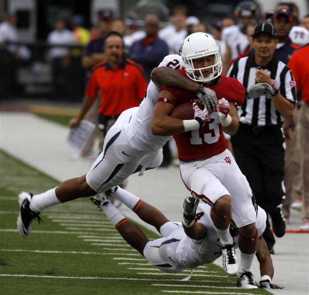 Sophomore wide receiver Kofi Hughes runs down the sideline after receiving a catch on Saturday at Memorial Stadium. Mark Felix