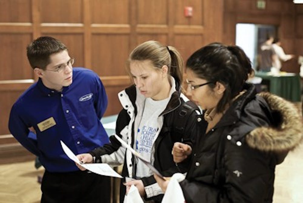Brandon Foltz \ IDS Nicholas Monroe of Woodbridge Apartments assists seniors Stacey Kaeding (center) and Valerie Strzelinski (right) during the 2008 Housing Fair held in the IMU's Alumni Hall Wednesday afternoon. The Housing Fair is an opportunity for students to search for housing in the following semesters.