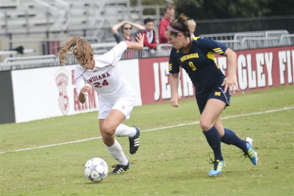 Freshman midfielder Monica Melink fights for the ball during the Hoosiers' 0-1 loss to the Michigan Wolverines on Sunday at Jerry Yeagley Field. Steph Langan