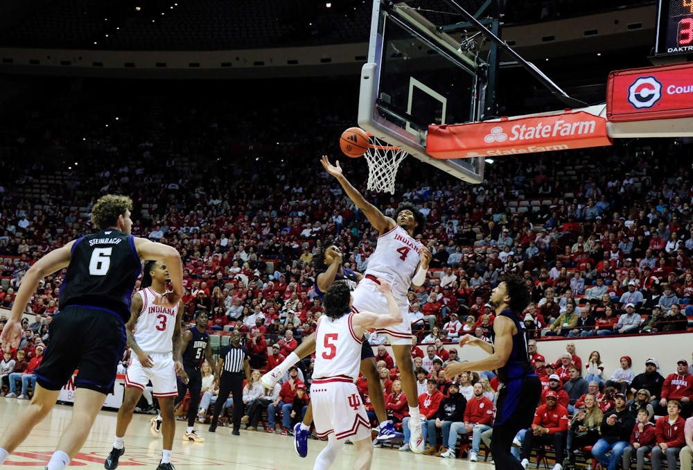 Senior forward Sam Alexis is pictured at the basket against Washington on Jan. 4, 2026, inside Simon Skjodt Assembly Hall in Bloomington. The Hoosiers defeated Maryland 84-66 on Wednesday night. Sophia Kaplan